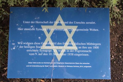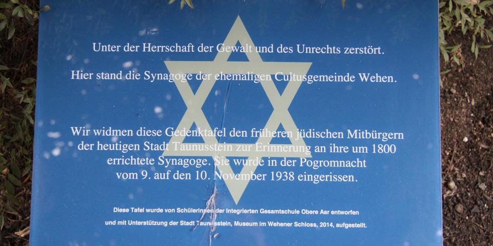 Auch ein zweiter Versuch, an die Wehener Juden und ihr Gebetshaus zu erinnern, scheiterte kläglich. Schülerinnen der Gesamtschule in Wehen hatten eine Tafel mit dem Judenstern und der Aufschrift „Unter der Herrschaft der Gewalt und des Unrechts zerstört“ in einem Pflanzbeet vor dem Haus Weiherstraße 15, dem Standort der ehemaligen Synagoge, platziert. Offenbar zum Unmut von Unbekannten. Denn nach nur einem Jahr wurde die Tafel mit schwarzer Farbe beschmiert, in der Nacht darauf dann mit roher Gewalt zertreten.
