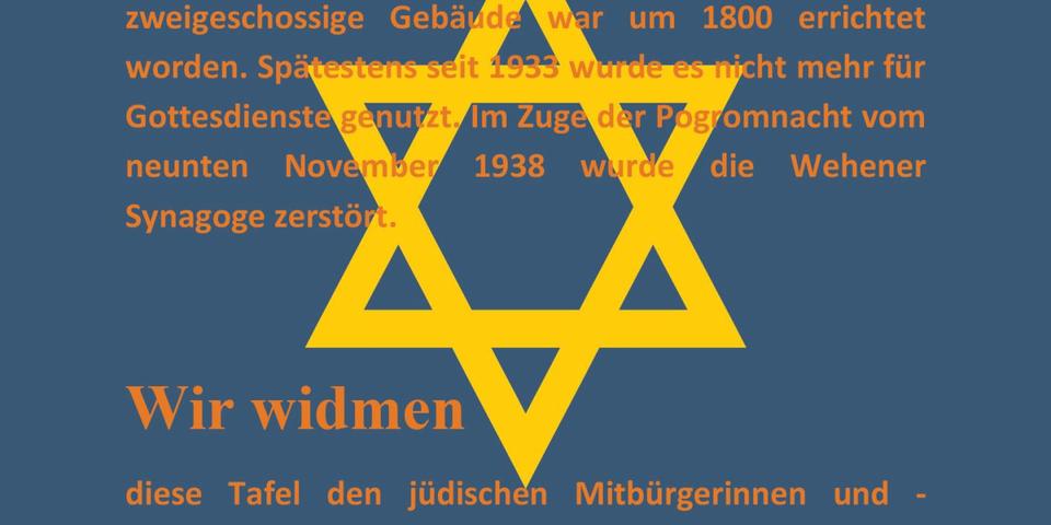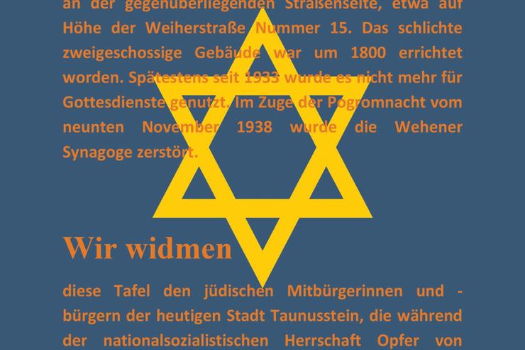 Darin wird vorgeschlagen, eine Stele / Gedenktafel für die jüdischen Bewohner Taunussteins, die Opfer des Nationalsozialismus wurden, gegenüber des Standorts der ehemaligen Synagoge in Wehen am Schloss aufzustellen. Aus Sicht der Verwaltung wäre solch ein Gedenkort „realisierbar“. Der Verwaltung liegt eine Zustimmungserklärung der Erbbauberechtigten des Schlosses für die mögliche Aufstellung einer Stele vor. Die Aufstellung einer Sitzgruppe wird allerdings abgelehnt. Die Verwaltung sieht dies „in Verbindung mit einer Gedenktafel zu einem derart sensiblen historischen Thema als unangemessen“ an. Eine Nutzung beispielsweise für Picknicks und die mögliche Verschmutzung „wäre absehbar und Anlass für Ärgernisse“. Das Ziel sei eine Stele, wie sie von der Lokalen Agenda 21 zu verschiedenen Themen bereits installiert wurden.